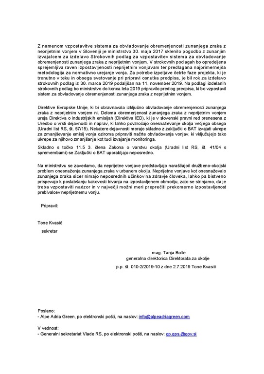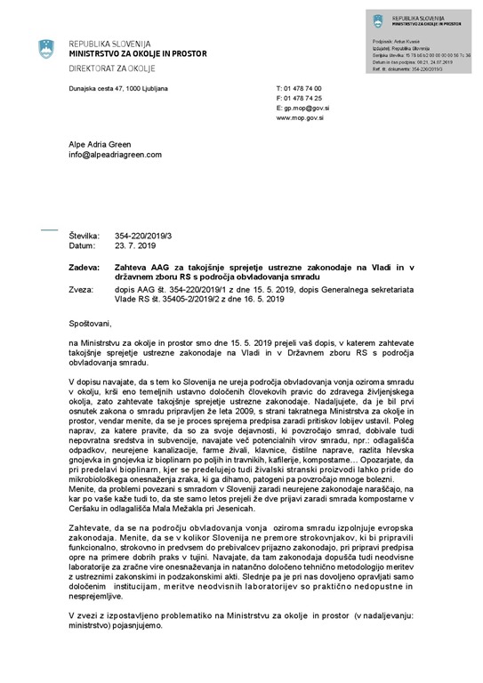 Na Ministrstvo za okolje in prostor ter druge državne organe smo iz Alpe Adria Green dne 15. 5. 2019 poslali dopis, v katerem smo zahtevali takojšnje sprejetje ustrezne zakonodaje na Vladi in v Državnem zboru RS s področja obvladovanja smradu. Po dveh mesecih smo prejeli odgovor iz Ministrstva za okolje in prostor: