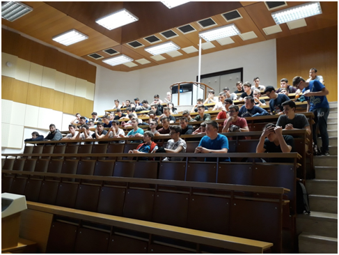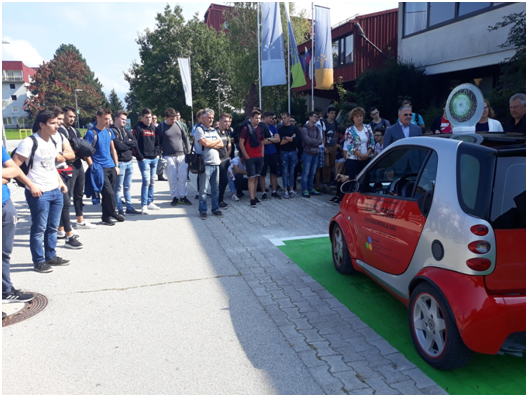 V okviru izobraževalno –ozaveščevalnih predavanj smo v torek 17.9. 2019 že izvedli prvo predavanje, za katerega so vsebinsko in strokovno poskrbeli strokovni sodelavci našega projektnega partnerja Inštituta Metron, vodilne institucije na področju inovacij v e- mobilnosti v Sloveniji. Predavanje smo izvedli skupaj z uradno otvoritvijo polnilne postaje za električna vozila, ki so jo v okviru lanskega projekta E-Pol načrtovali in sestavili dijaki ŠC Kranj. Dijaki so tako bili seznanjeni z konceptom trajne mobilnosti, prednostmi in slabostmi e- mobilnosti. Prav tako pa so v okviru predavanja lahko preizkusili tudi električni avto. Odziv dijakov je bil odličen, predavanja se je udeležilo več kot 60 dijakov.
