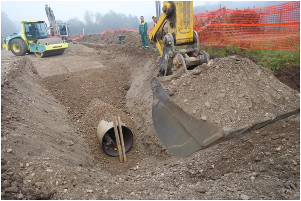 Foto AAG: Kanalizacijske cevi položene v prodna tla, kanalizacija pa poteka po mejah parcel, kot kača, namesto v ravni liniji.
