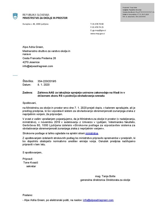 Ministrstvo za okolje in prostor RS je v svojem odgovoru na naše vprašanje z 15. 5. 2019 ki smo ga poslali v dopis, v katerem smo zahtevali takojšnje sprejetje ustrezne zakonodaje na Vladi in v Državnem zboru RS s področja obvladovanja smradu. Po dveh mesecih smo prejeli odgovor iz Ministrstva za okolje in prostor v katerem so nam zagotovili, da bodo, z namenom vzpostavitve sistema za obvladovanje obremenjenosti zunanjega zraka z neprijetnim vonjem v Sloveniji je ministrstvo 30. maja 2017 sklenilo pogodbo z zunanjim izvajalcem za izdelavo Strokovnih podlag za vzpostavitev sistema za obvladovanje obremenjenosti zunanjega zraka z neprijetnim vonjem. V strokovnih podlagah bo opredeljena sprejemljiva raven izpostavljenosti neprijetnim vonjavam ter predlagana najprimernejša metodologija za normativno urejanje vonja. Za potrebe izpeljave četrte faze projekta, ki je trenutno v teku in obsega svetovanje pri pripravi osnutka predpisa, je bil rok za izdelavo strokovnih podlag iz 30. marca 2019 podaljšan na 11. november 2019. Na podlagi izdelanih strokovnih podlag bo ministrstvo do konca leta 2019 pripravilo predlog predpisa, ki bo vzpostavil sistem za obvladovanje obremenjenosti zunanjega zraka z neprijetnim vonjem.