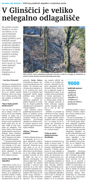 Krajanka je AAG opozorila na veliko odlagališče odpadkov v Klancu pod Kozino, na začetku soteske Glinščice, desno od prvega slapu Glinščice, desno od mosta, po katerem pelje cesta do Klanca. Odlagališče se nahaja v občini Občina Hrpelje-Kozina.![]()