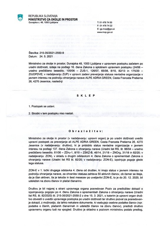Po dveh mesecih, ko smo oddali poročilo o delu in finančno poročilo, smo iz MOP dobili SKLEP, da smo pridobili oziroma zadržali status v javnem interesu, na področju narave, sklepa za področje okolja pa še nismo prejeli.