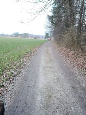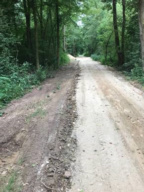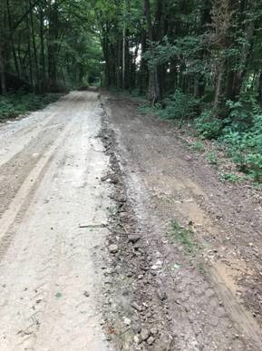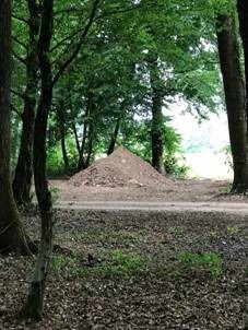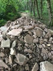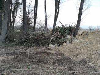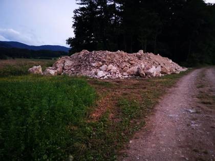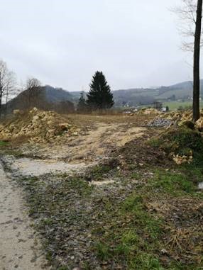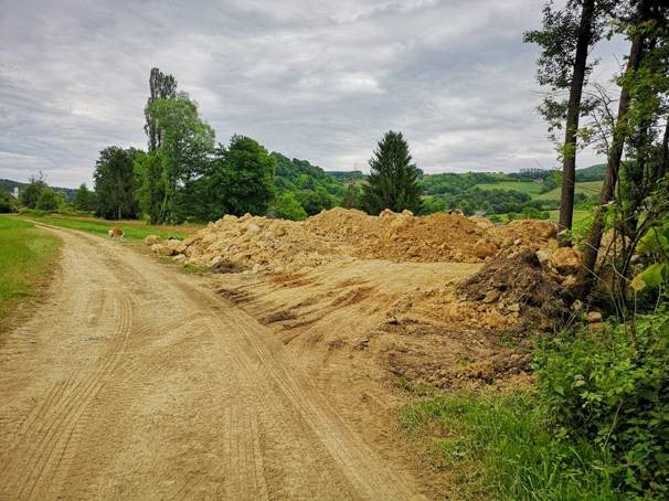 Na sliki je kup gradbenega in drugega materiala ki bi se naj uporabil za tampon. Med izkopom za novo cesto so poškodovali koreninski sistem dreves v bližini kar se že opazi na drevesih.