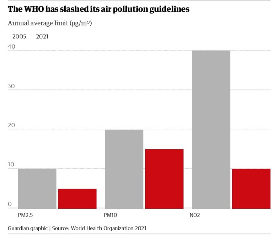 V prvi posodobitvi za 16 let se je napovedna meja za najbolj škodljivo onesnaženje – drobne delce pri sežiganju fosilnih goriv – prepolovila. Nova meja za dušikov dioksid (NO 2 ), ki jo večinoma proizvajajo dizelski motorji, je zdaj 75% nižja.