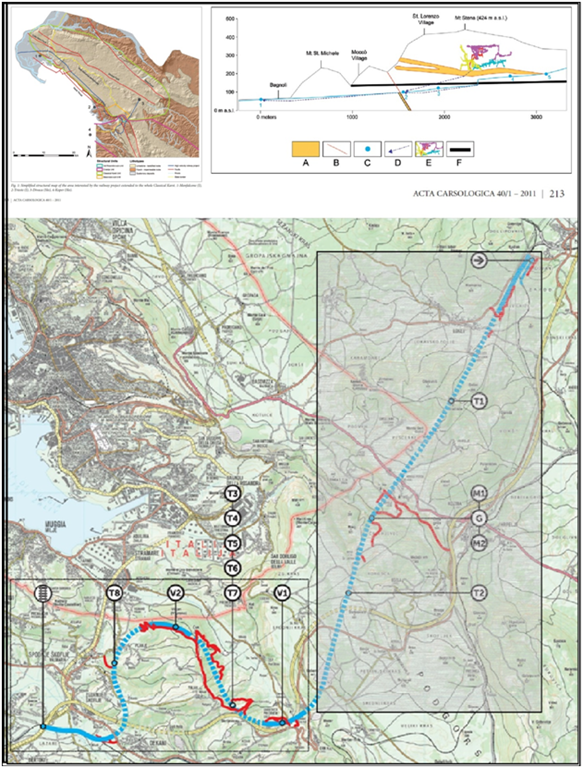 Slika posega z dolgim tunelom globoko pod nepropustno flišno plast (rumeno) z vodnimi viri (modro) v ob(čez) mejnem območju naravnega rezervata (vir: https://ojs.zrc-sazu.si/carsologica/article/view/38).