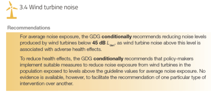 Menimo, da bi bilo bistveno primerneje, da bi se NIJZ naslonil na WHO. Svetovna zdravstvena organizacija WHO namreč v svoji zadnji smernici priporoča omejitve s hrupom vetrnih elektrarn z A uteženo ravnijo, vendar na povsem drugačen način, oziroma za povsem drug kazalec kot to interpretira Uredbe o mejnih vrednostih kazalcev hrupa v okolju (Uradni list RS, št. 43/18). Prilagamo pripadajoči izsek iz te smernice, ki obravnava hrup vetrnih elektrarn: