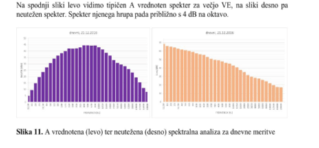 Napačno merjenje hrupa vetrnih elektrarn je razvidno iz spodnjega diagrama (prikazan na Mednarodnem znanstvenem posvetu: Hrup vetrnih elektrarn in mogoči vplivi na življenjsko okolje, Ljubljana, 15. januar 2020, avtor diagrama dr. Ferdinand Deželak). Levi diagram prikazuje meritev hrupa vetrne elektrarne v Dolenji vasi v dBA (s filtrom A, tudi utež imenovan), desni diagram pa brez filtra, torej v dB.