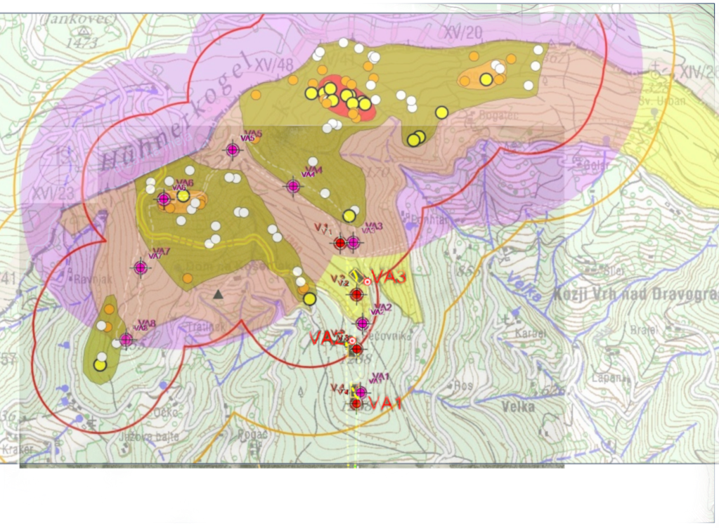 - Dodatno je tudi vprašljiva lokacija VA-2, ki jo je projektant v primerjavi z odobreno lokacijo (V3) postavil rahlo bolj severno in po analizi slike sodeč tudi na območju znotraj 500m radija od zabeležene aktivnosti divjega petelina.