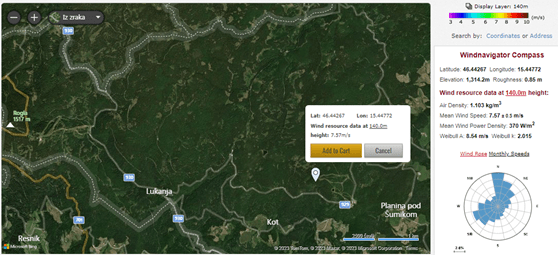 Povprečna hitrost vetra 7.57m/s pri višini rotorja 140m