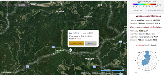 Povprečna hitrost vetra 7.09m/s pri višini rotorja 140m.