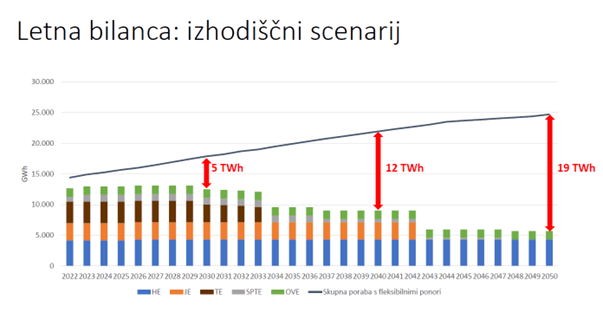 Glede na napovedi iz Strategije razvoja elektroenergetsko-podnebnega sistema Slovenije se ocenjuje, da bo od izhodiščnega stanja iz 2020 (! in ne 2010)[1], zaradi procesa elektrifikacije in gospodarske rasti RS, poraba električne energije do leta 2050 zrasla za 74% ali 10 TWh.