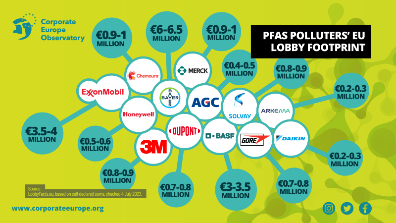 Z uporabo podatkov LobbyFacts iz registra preglednosti lobijev v EU je Corporate Europe Observatory izračunal, da so ti proizvajalci kemikalij po lastni izjavi skupne porabe lobijev v EU (za vse teme) v zadnjem letu med 13,7 milijona EUR in 15,5 milijona EUR, za katere so so posredovali številke, pri čemer imajo trenutno 53 vstopnic za Evropski parlament. Vseh 12 največjih proizvajalcev se ni pridružilo registru lobistov EU: Archroma in Dongyue se nista, vendar se zdi, vsaj v primeru prvega, še vedno dejavno lobirata v EU glede PFAS (glej spodaj).