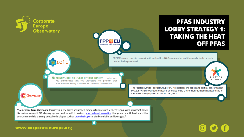 Zdi se, da takšen pristop dejansko prevladuje v Bruslju, pri čemer se podjetja in drugi korporativni akterji zelo potrudijo, da očitno prepoznajo naraščajočo zaskrbljenost javnosti glede PFAS in svojo pripravljenost za sodelovanje z regulatorji, da bi to rešili. Cilj te strategije je odvzeti toploto PFAS, hkrati pa ustvariti vtis, da je industrija razumen in legitimen akter, na katerega se lahko zanesemo, da bo naredil pravo stvar.