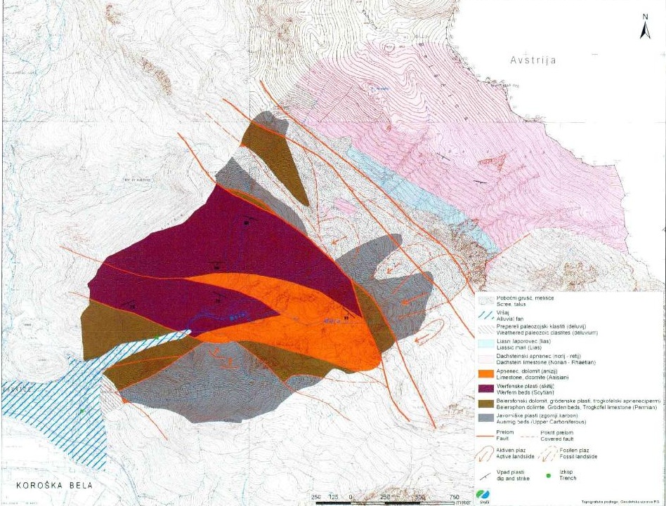 Kot kaže so na območju Karavank predvsem tektonsko porušene klastične in podrejeno karbonatne kamnine karbonske starosti najbolj nestabilne in z vidika ogroženosti zaradi procesov pobočnega premikanja najbolj nevarne. Prav v teh kamninah je na Potoški planini nastal obsežen zemeljski plaz (slika 2), ki je del zaledja vršaja Koroška Bela. Pobočni material je v premikanju že več let, kar dokazujejo deformacije na gozdni cesti, ki poteka preko plazu ter ukrivljena starejša drevesa na plazu. Dolžina plazu je približno 550 m, širina pa do 250 m. Globino ocenjujemo na 5 do 10 m. Ocenjena količina premikajočih zemeljskih mas je tako med 700.000 in 1.400.000 m 3 . Plaz sestavljajo v coni Košutinega preloma deformirani črni skrilavi glinavci in meljevci, kremenovi konglomerati in peščenjaki, črni masivni apnenci s kalcitnimi žilami ter apnenčev pobočni grušč, ki prekriva prej omenjene kamnine. Odlomni rob plazu se je oblikoval v meliščih pod strmo skalno steno iz dachsteinskega apnenca. Vznožje plazu se nahaja nad več deset metrov visoko strmo skalno stopnjo, preko katere pada kamenje in posamezna drevesa. V zgornjem delu plazu je izvir Urbas, poleg njega se na robovih plazu pojavljajo še manjši izviri in solzila. Vode tečejo vzdolž plazu in razmakajo plazino. Znaki fosilnega plazenja v neposredni povezavi s karbonskimi kamninami so opazni tudi na drugih lokacijah v okolici Potoške planine (slika 1).