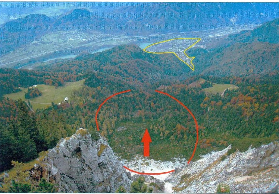 Slika 2. Lega vršaja Koroška Bela (rumeno) ter plazu na Potoški planini (rdeče).