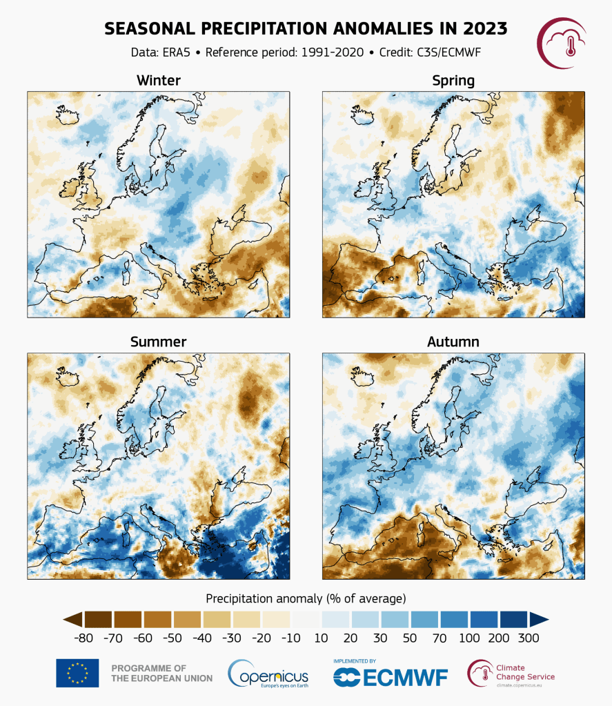 Sezonske anomalije v padavinah za Evropo glede na ustrezna sezonska povprečja za referenčno obdobje 1991–2020 za borealno zimo 2022–2023 ter pomlad, poletje in jesen 2023. Anomalije so izražene kot odstotek sezonskih povprečij za 1991–2020 . Vir podatkov: ERA5 Zasluge: C3S/ECMWF.
