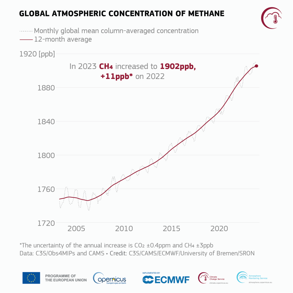 Porast metana ostaja visok, vendar ni tako visok kot v zadnjih treh letih. Atmosferske koncentracije metana so v 20. stoletju močno narasle, da bi se ustavile od leta 2000 do 2006. Na podlagi dodatnih virov podatkov, vključno z meritvami in situ in iz ledenih jeder, so bile koncentracije CO 2 v ozračju leta 2023 višje kot kadar koli v vsaj 2.000.000 let. Atmosferske koncentracije CH 4 so bile leta 2023 višje kot kadar koli v zadnjih 800.000 letih.