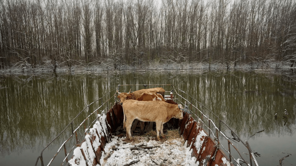 Krave, teleta in konji so se zaradi nižanja temperatur soočali z lakoto in mrazom. Obtičali so na otoku Krčedinska ada sredi reke Donave, potem ko se je vodostaj prejšnji mesec močno dvignil in jim onemogočil pot nazaj na obalo.