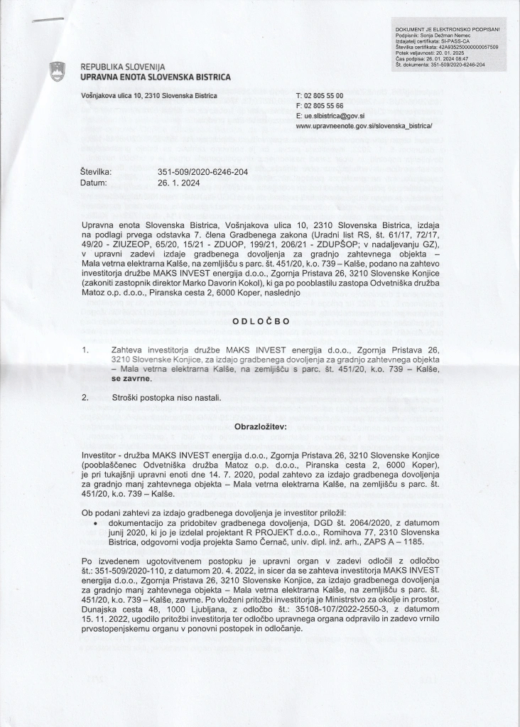 Upravna enota Slovenska Bistrica zavrnila pritožbo inestitorja v primeru VE Kalše