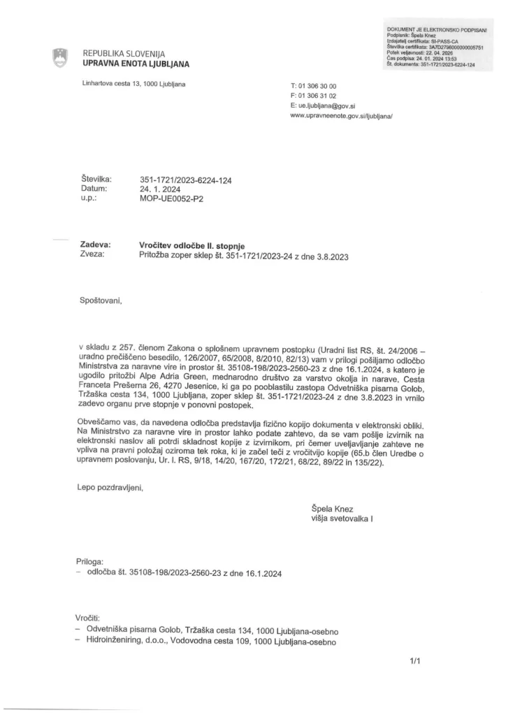Mednarodno društvo za varstvo okolja in narave Alpe Adria Green (AAG), ki ima priznan javni interes na področju okolja in narave, je 17.07.2023 priglasilo na Upravno enoto Ljubljana udeležbo za stranskega udeleženca v postopku pridobivanja gradbenega dovoljenja za kanal C0 na parceli št. 2324 k.o. 1735 Stožice. …