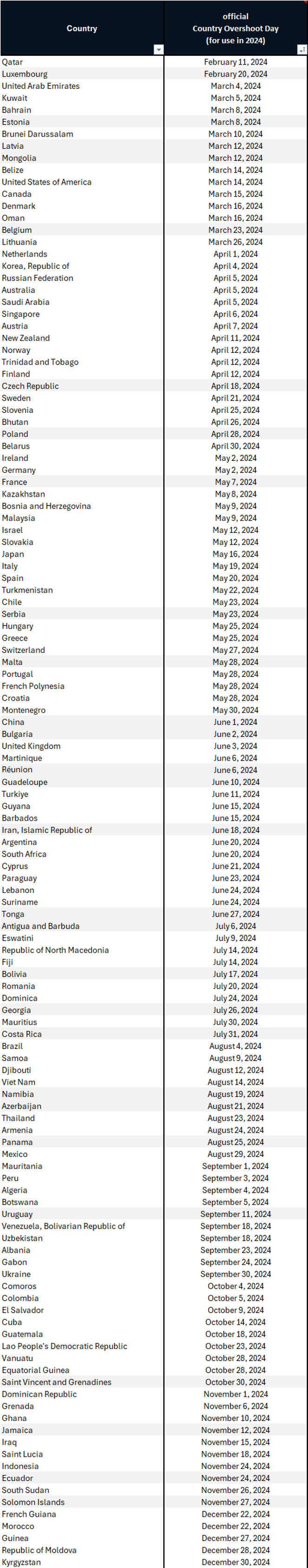 Dnevi prekoračitve v državi so objavljeni 1. januarja vsako leto, pri čemer se uporablja zadnje leto najnovejše izdaje računov nacionalnega odtisa in biokapaciteta. Zato dnevi preseganja držav za leto 2024 temeljijo na izdaji za leto 2023 .