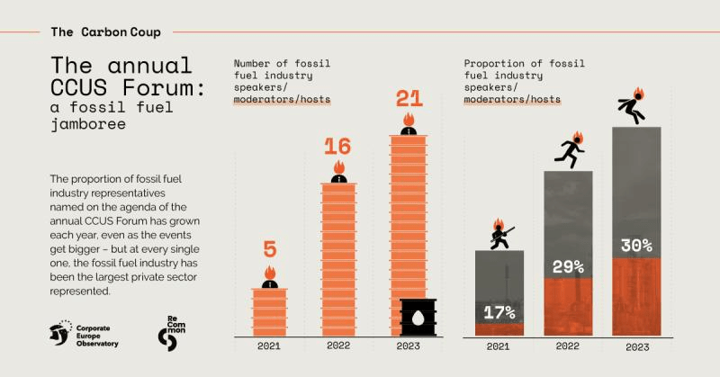- Forum CCUS ni skupinski, ampak vsakoletni dogodek, na katerem se ustanovijo delovne skupine, ki vsako leto podajo predloge. Naše poročilo ugotavlja, da forum CCUS vsako leto postaja večji in v njem bolj prevladujejo interesi za fosilna goriva – od podjetij, kot so Equinor, TotalEnergies, Shell in Snam, do lobističnih skupin, kot sta Mednarodno združenje proizvajalcev nafte in plina (IOGP) in platforma za ničelne emisije ( ZEP). Do danes je vsaki delovni skupini foruma CCUS sopredsedovala industrija fosilnih goriv ali organizacije, ki so z njo povezane, največji sektor, zastopan v teh delovnih skupinah, pa je bila dosledno industrija fosilnih goriv. Medtem pa je vloga nevladnih organizacij in akademskega sveta razmeroma majhna (medtem ko je vloga skupin, ki so kritične do CCUS, praktično neobstoječa).