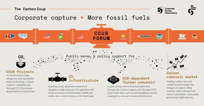 - Skupine, v katerih prevladuje industrija fosilnih goriv, vse bolj dobivajo uradno vlogo pri oblikovanju podnebne in energetske politike EU. Forum CCUS, ki ga je leta 2021 ustanovila Evropska komisija, je bil povabljen k usmerjanju regulacije in javnega financiranja za CCUS, povezano infrastrukturo CO2 in špekulativne tehnologije za „odstranjevanje ogljika“, ki temeljijo na zajemanju in shranjevanju ogljika (CCS).