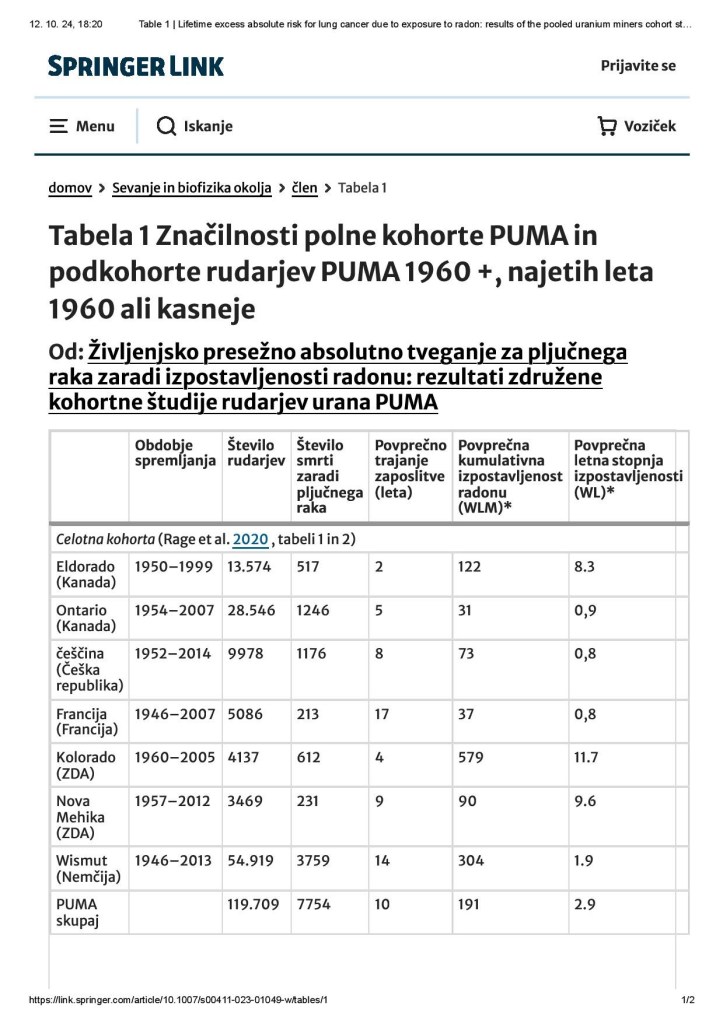 Življenjsko presežno absolutno tveganje za pljučnega raka zaradi izpostavljenosti radonu: rezultati združene kohortne študije rudarjev urana PUMA, datum 03. januar 2024