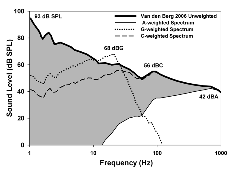 Diagram razkriva, kako merjenje hrupa VE s filtrom A izključi ali bistveno zniža nizkofrekvenčni hrup (pod 200 Hz) in infrazvok (pod 20 Hz). Če je hrup 42 dBA, je dejanski hrup VE 93 dB Lin (brez filtrov). Ni pomembno ali se sliši ali ne, vibracije so v vsakem primeru (glej še predavanje dr. Pereire). In te so z leti bivanja v takem hrupu zdravju izredno škodljive (glej predavanje dr. Pereire).