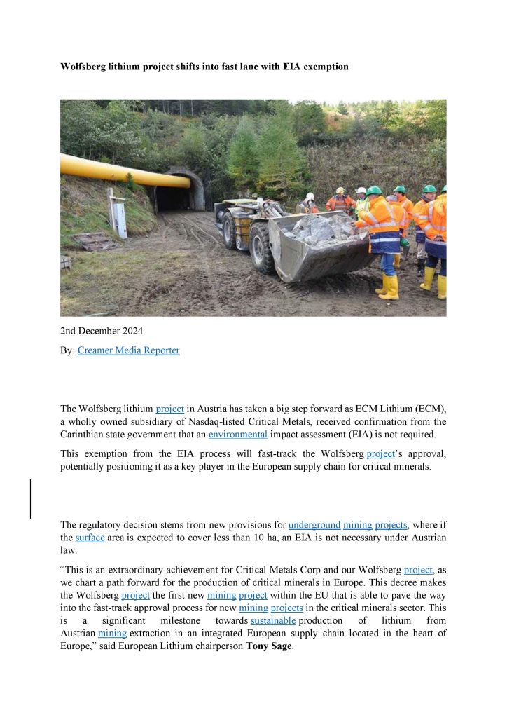 Wolfsbergov litij projekt v Avstriji je naredila velik korak naprej, saj je ECM Lithium (ECM), hčerinska družba v popolni lasti družbe Critical Metals, ki kotira na borzi Nasdaq, prejela potrditev koroške deželne vlade, da je Okoljska ocena učinka ni potrebna.