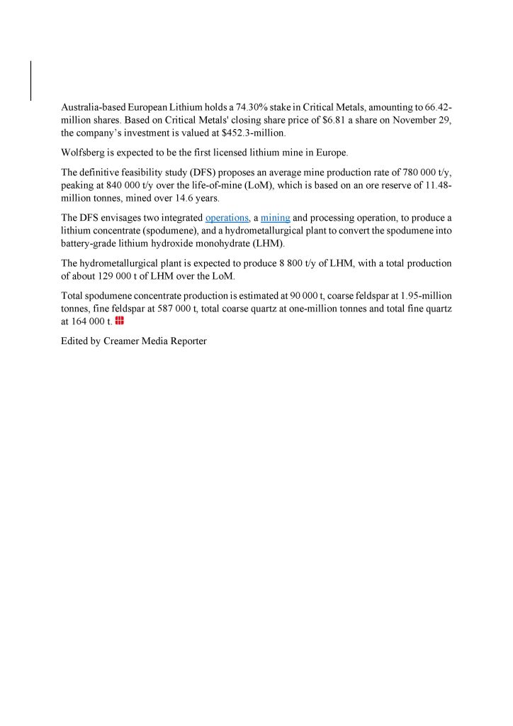 “To je izjemen dosežek za Critical Metals Corp in naš Wolfsberg projekt, ko začrtujemo pot naprej za proizvodnjo kritičnih mineralov v Evropi. Ta odlok naredi Wolfsberg projekt prvi novi Rudarstvo projekt EU, ki lahko utira pot hitremu postopku odobritve novihRudarskih Projektov v sektorju kritičnih mineralov. To je pomemben mejnik na poti Trajnostni proizvodnji litija v Avstriji. Rudarsko pridobivanje v integrirani evropski dobavni verigi, ki se nahaja v osrčju Evrope,” je dejal predsednik Evropskega litija Tony Sage.
