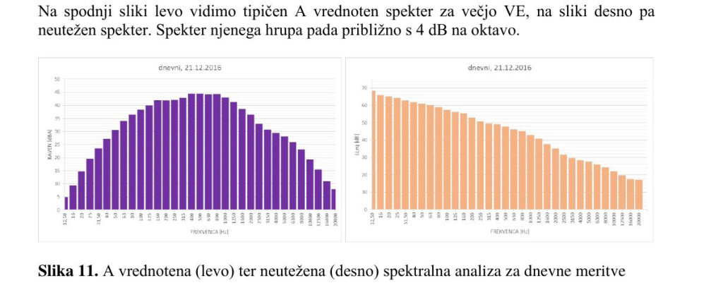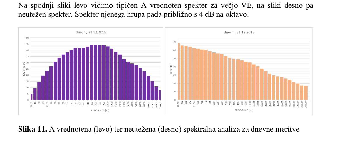 Diagram hrupa (desni diagram) vetrne elektrarne pri Dolenji vasi, občina Divača. Meritve so bile predstavljene na znanstveni konferenci o hrupu vetrnih elektrarn v Ljubljani, januarja 2021.