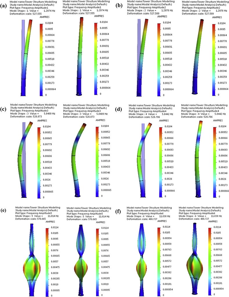 Fig. 4. Modal shapes of the wind turbine tower structure; (a) The first mode, (b) The second mode, (c) The third mode, (d) The fourth mode, (e) The fifth mode, (f) The sixth mode