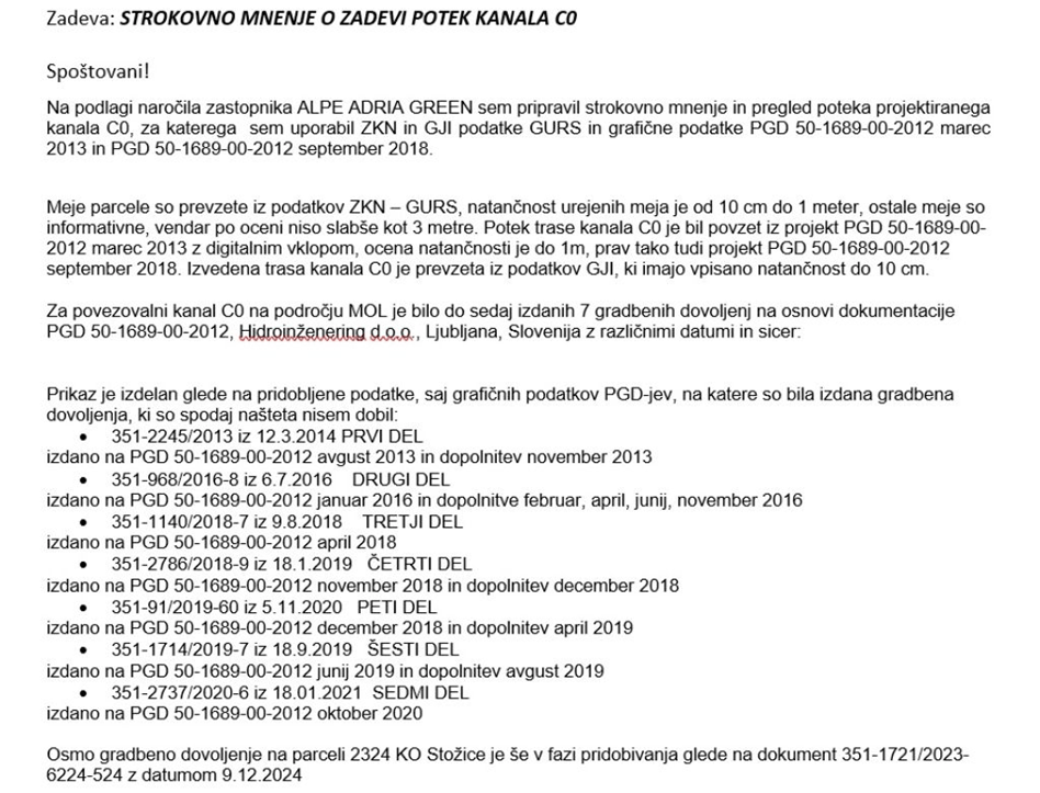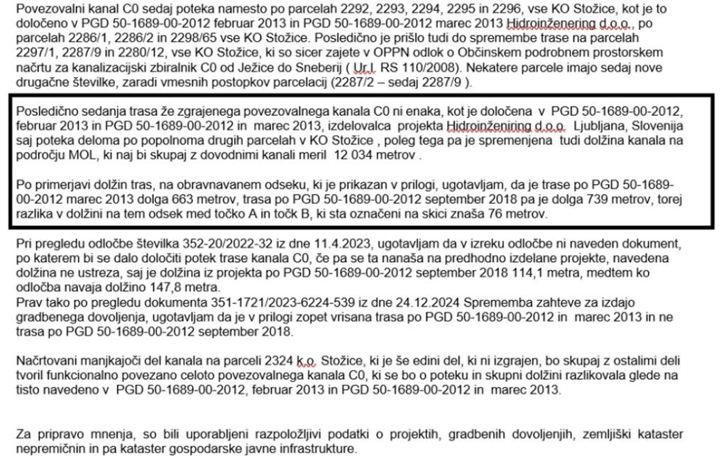 Kot pa izhaja iz novega izvedenskega mnenja, se je trasa kanala C0 v letih 2018-19, torej po prej omenjenih spornih sklepih ARSO v letih 2015 in 2016, da presoje vplivov na okolje ni potrebno opraviti, v projektni gradbeni dokumentaciji spremenila glede na traso iz leta 2012 na način, da poteka po popolnoma drugih parcelah; to pomeni, da so bila gradbena dovoljenja izdana za traso, za katero ni bilo odločeno, ali je zanjo treba opraviti presojo vplivov na okolje ali ne. Prav tako sedanja trasa že zgrajenega kanala C0 ni enaka trasi iz projektne gradbene dokumentacije iz let 2012 in 2013, saj poteka po popolnoma drugih parcelah v KO Stožice, poleg tega pa je spremenjena tudi dolžina kanala C0, ki naj bi skupaj z dovodnimi kanali meril 12.034 metrov.