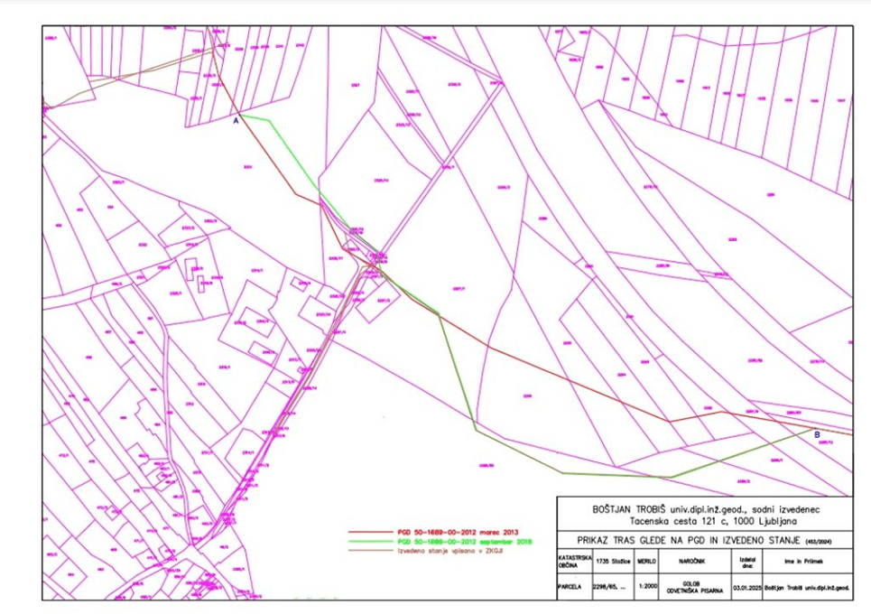 Sodni izvedenec je takole dokazal, da trasa poteka povsem drugače, kot je to zarisal MOL in na podlagi projektne dokumentacije, s katero je pridobival dovoljenja. foto: arhiv Domovine.