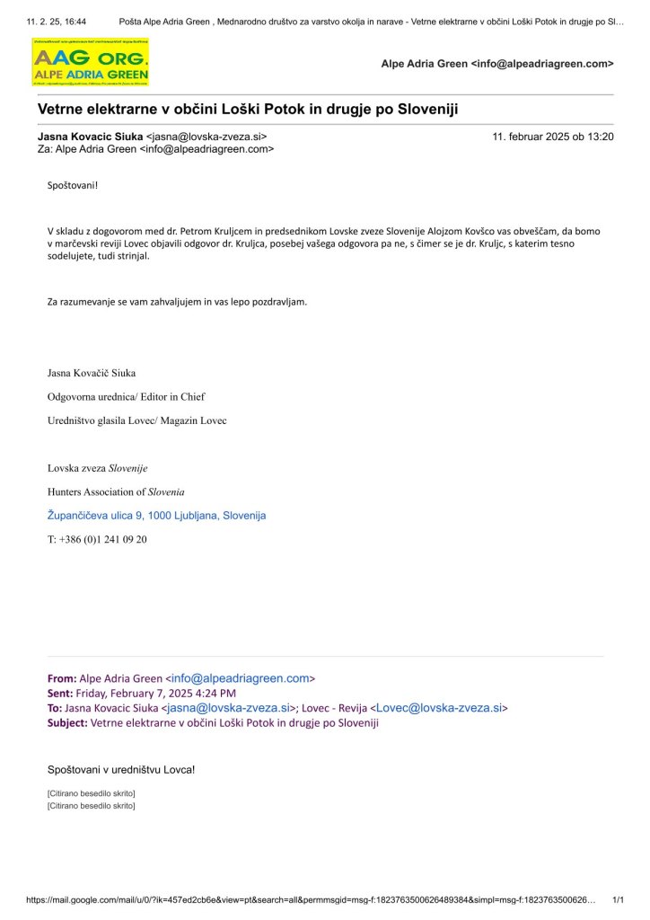 Cenimo lovsko organizacijo in lovske družine. Zato odklanjamo osebno obračunavanje avtorja Benčine, ki povrh v članku potvarja delovanje našega društva v zvezi z nesprejemljivimi načrti izgradnje industrijskih con s škodljivimi objekti, kot so to vetrne elektrarne (VE) za ljudi in živali v pristni naravi. AAG ima uradno pravico zastopati javni interes na področju okolja in narave. In zato že več kot deset let branimo oboje pred razvrednotenjem slovenskega prostora z načrti gradnje vetrnih elektrarn, ki jih dejansko ne potrebujemo. Imamo dovolj stabilnih virov elektrike. Vlaganje v naključno elektriko po vetru, še dodatno podprto s subvencijami in podkupovanjem občin in lastnikov parcel, je družbeno škodljivo, ker potrebujemo denar za naš razvoj, ne pa za metanje v veter.