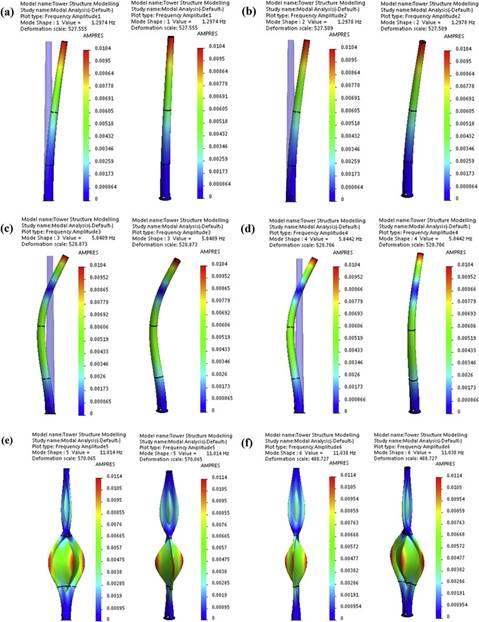 Modal shapes of the wind turbine tower structure; (a) The first mode, (b) The second mode, (c) The third mode, (d) The fourth mode, (e) The fifth mode, (f) The sixth mode