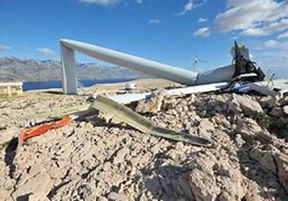 Analiza dogodka: Najprej se je zlomilo eno krilo od treh, vsaka je dolga 25 m. Zaradi centrifugalne sile je krilo odletelo več sto metrov stran, nastalo je neravnovesje tež in se je steber z generatorjem teže 35 ton večkrat zlomil in zrušil.