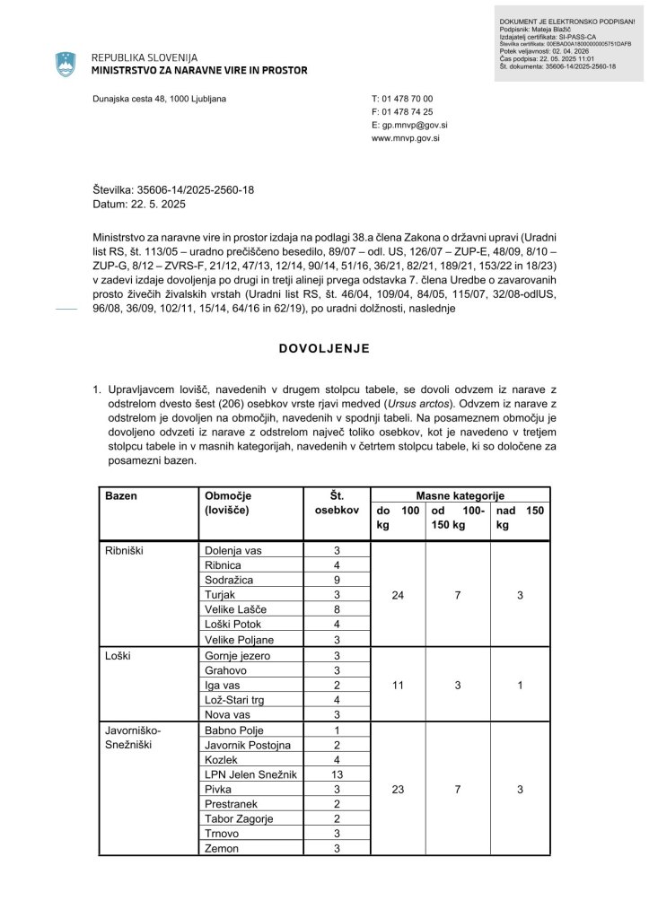 - leta 2025 pa je dovoljen odstrel še dodatnih 206 medvedov.