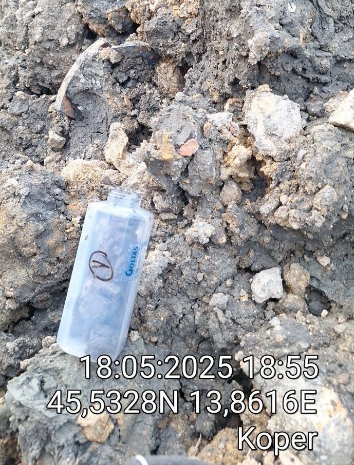 Vzorce so označilai: vzorec-1 (vzet na lokaciji-3, severna terasa, mesto prvotno deponiranega mulja, pripeljanega že pred 28. 4. 2024), vzorec-2 (vzet na lokaciji-2, sredinska terasa, mesto vgradnje mešanih zemljin neznanega izvora), vzorec-3 (vzet na lokaciji-1, južna terasa, mesto vgradnje mulja na parcelah 1707/99 in 1707/98) ter dokumentirala mesta odvzema z zabeležbo gps pozicije na fotografijah.