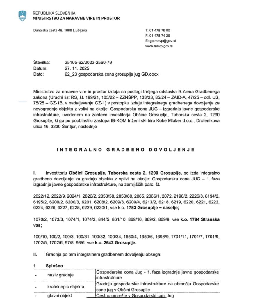 29. decembra pa je bila, prav tako v zastopstvu Alpe Adria Green, vložena še ena tožba zoper integralno gradbeno dovoljenje, v katerem ministrstvo v nasprotju z odločbama ustavnega in upravnega sodišča še vedno uporablja neustavno in nezakonito uredbo o hrupu, s tem pa povzroča škodo gospodarstvu, predvsem gradbeništvu. Ministrstvo za naravne vire in prostor je izdalo tudi integralno gradbeno dovoljenje za novogradnjo objekta z vplivi na okolje: Gospodarska cona Jug – izgradnja javne gospodarske infrastrukture, projektno dokumentacijo pa je v tem primeru pripravil Inženirski biro Kobe Mlaker, d. o. o. Gradnja bi po omenjenem gradbenem dovoljenju obsegala Gospodarsko cono Jug – 1. fazo izgradnje javne gospodarske infrastrukture, širitev cestnega omrežja z novogradnjo občinskih cest s pripadajočimi križišči, avtobusnimi postajališči, površine za pešce in kolesarje, prometno opremo ter cestno razsvetljavo, dograditev vodovodnega omrežja znotraj GC Jug in priključitev na obstoječe omrežje. V Grosupljem načrtujejo tudi dograditev kanalizacijskega omrežja, srednje- in nizkonapetostnega elektroenergetskega omrežja in transformatorskih postaj ter dograditev telekomunikacijskega omrežja. Celoten projekt je zaradi tožbe nevladne organizacije Alpe Adria Green (gre za identično težavo: projektna dokumentacija in priložena presoja vplivov na okolje sta bili izdelani na podlagi nezakonite uredbe o hrupu) obvisel v zraku. Kot je razvidno iz tožbe proti Vladi Republike Slovenije, nevladna organizacija pravzaprav uporablja enake argumente v vseh zadevah, in sicer prej omenjeno sodbo upravnega sodišča, ki je zrušilo gradbeno dovoljenje za gradnjo 3. razvojne osi – jug: »Institut exceptio illegali je institut, ki je praviloma pridržan sodiščem in ne upravnim organom. Posebnosti pa veljajo glede prava EU. Po načelu primarnosti ima pravo EU prednost v razmerju do nacionalnega prava, tj. do nacionalnih predpisov kakršnegakoli ranga, vključno z ustavo. Takšna obveznost velja za vse organe javne oblasti, saj to terja načelo lojalnega sodelovanja. To pomeni, da morajo tudi upravni organi države članice pri odločanju upoštevati pravo EU, in če je to potrebno, opustiti uporabo določb nacionalnega prava, ki je z njim v nasprotju (72. točka citirane sodbe).« Nadalje iz citirane sodbe izhaja tudi sledeče: »Republika Slovenija ne more izdajati gradbenih dovoljenj za objekte z vplivi na okolje na podlagi predpisa, ki je bil sprejet s kršitvijo določb Aarhuške konvencije in s tem prava EU.«