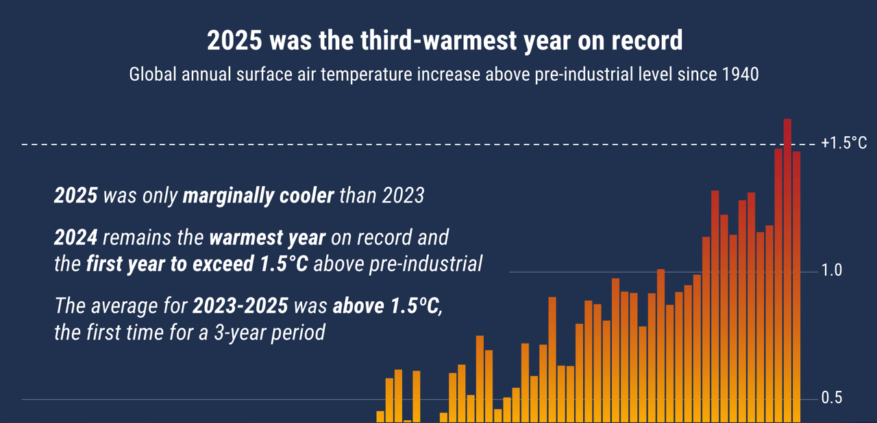 Čeprav je bilo leto 2025 za 0,13 °C hladnejše od leta 2024 – najtoplejšega leta v zabeleženi zgodovini – znanstveniki poudarjajo, da to ne pomeni obrata trenda segrevanja.