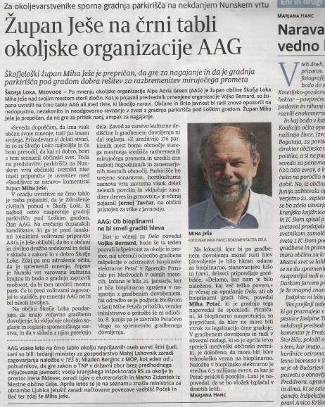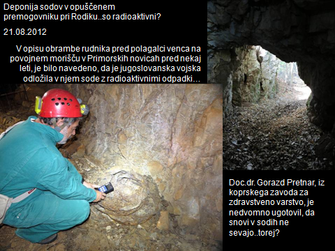 | Za neprijetne vonjave ni uredbe V okoljevarstveni organizaciji AAG so se pritožili zoper okoljevarstveno dovoljenje za obratovanje bioplinarne v Zgornjih Pirničah. Zgornje Pirniče – Republiška agencija za okolje je sredi junija izdala okoljevarstveno dovoljenje glede emisije snovi v zrak za obratovanje naprave upravljavca Bioštrom v Zgornjih Pirničah. V mednarodni okoljski organizaciji Alpe Adria Green (AAG) so zoper izdano dovoljenje že vložili pritožbo. »Pri izdaji dovoljenja so kršili Aarhuško konvencijo, saj krajani Zgornjih Pirnič, ki so tudi člani AAG, niso bili obveščeni, da se okoljevarstveno dovoljenje pripravlja, čeprav bi morali biti vključeni pri njegovi obravnavi kot že priznani stranski udeleženci v postopku,« je pritožbo utemeljil predsednik AAG Vojko Bernard. AAG pri tej pritožbi zastopa več kot petdeset krajanov, ki so že izpostavljeni negativnim vplivom na okolje. »Okoljevarstveno dovoljenje je bilo izdano ne glede na to, da upravljavec ne izpolnjuje osnovnih pogojev za skladiščenje substrata in drugih goriv, saj ta skladišči na nepokritem prostoru. Pri gnitju gorivo povzroča neznosen smrad, pri tem pa se sproščajo tudi strupeni plini, ki vplivajo na zdravje ljudi, kar so dokazali v zdravstvenem domu v Medvodah,« je opozoril Bernard. Emisij neprijetnih vonjav, je ob tem pojasnila Tanja Cegnar z agencije za okolje, v tem koljevarstvenem dovoljenju niso obravnavali. »V Sloveniji ni nobene uredbe, ki bi urejala področje vonjav,« je pojasnila. Dodala je še, da agencija v skladu z uredbo o odpadkih ni izdala okoljevarstvenega dovoljenja za predelavo odpadkov v navedeni bioplinarni, saj stranka sploh ni vložila vloge. »Prav tako agencija za bioplinarno ni izdala okoljevarstvenega soglasja,« je pojasnila Tanja Cegnar. »Glede na navedbe v vlogi za pridobitev okoljevarstvenega dovoljenja glede emisije snovi v zrak upravljavcu v skladu z uredbo o obdelavi biološko razgradljivih odpadkov ni potrebno pridobiti okoljevarstvenega dovoljenja za obdelavo odpadkov, ker bo v bioplinarni predeloval gnoj, ki bo nastajal v okviru kmetijskega gospodarstva oziroma farme goveda, kjer bo potekala tudi obdelava biološko razgradljivih odpadkov.« Inšpekcija za okolje in naravo pa je podjetju Bioštrom že oktobra lani odredila odstranitev odpadne silaže s platoja silosa. Ker inšpekcijske odločbe ni izpolnil, so pojasnili pri inšpektoratu za okolje in naravo, so ga z denarno kaznijo v višini deset tisoč evrov prisilili k izpolnitvi odločbe. »Konec junija smo na kontrolnem pregledu na lokaciji bodoče bioplinarne v zvezi z izrečenim inšpekcijskim ukrepom ugotovili, da zavezanec zaključuje z deli, potrebnimi za izpolnitev inšpekcijske odločbe,« so še dodali pri inšpektoratu. EKO PATRULJA AAG – Sodi v rodiškem premogovniku ne sevajoavgust 22, 2012Rate ThisDr. Gorazd Pretnar iz koprskega zavoda za zdravstveno varstvo se je z članom AAG Francem Malečkarjem, podal 21. avgusta 2012 v opuščen premogovnik pri Rodiku sledeč podatku iz članka v Primorskih novicah izpred nekaj let, da naj bi bili v njem sodi z radioaktivnimi odpadki. To so novinarki povedali domačini, ki so ubranili rudnik pred polagalci venca na domnevnem povojnem morišču. Že takoj za vrati je nekaj zmečkanih zarjavelih sodov, največji kup pa je okoli 100 m v notranjosti. Tam nasutje prsti in skal zapira nadaljevanje, ki ga izdaja prepih. Strokovnjak je ugotovil, da bela in zelena snov ilovnatega izgleda ne seva. Vzel je vzorec, saj se nahaja v vodozbirnem območju Rižanskega vodovoda, v njegovem tretjem zaščitnem pasu. Predlagal bo, da se podzemno divje odlagališče čim prej sanira in razišče, kaj se skriva za podorom. Po zadnjih podatkih, ki smo jih zbrali v AAG, so sodove navozoli iz Mitol – Ajdovščina, podor pa je bil umetno sprožen, da se ne bi videlo, kaj je v jami. Zopet eno breme preteklosti, za katerega se je vedelo, samo ukrepal ni nihče! KAJ BO, ČE PRIDE OB TEM POMANJKANJU PITNE VODE, ŠE DO ONESNAŽENJA VODE IZ TE JAME, KDO BO ODGOVOREN???Komisija za izbor imena tretjega četrtletja na črni listi, je izbrala:ŠE VEDNO NEZNANO ODGOVORNO OSEBO, KI JE ODGOVORNA ZA NELEGALNO ODVRŽENE SODOVE V RODIŠKEM RUDNIKU21. avgusta 2012 se je Eko patrulja podala v opuščen premogovnik pri Rodiku sledeč podatku iz članka v Primorskih novicah izpred nekaj let, da naj bi bili v njem sodi z radioaktivnimi odpadki. To so novinarki povedali domačini, ki so ubranili rudnik pred polagalci venca na domnevnem povojnem morišču. Že takoj za vrati je nekaj zmečkanih zarjavelih sodov, največji kup pa je okoli 100 m v notranjosti. Tam nasutje prsti in skal zapira nadaljevanje, ki ga izdaja prepih. Strokovnjak je ugotovil, da bela in zelena snov ilovnatega izgleda ne seva. Vzel je vzorec, saj se nahaja v vodozbirnem območju Rižanskega vodovoda, v njegovem tretjem zaščitnem pasu. Predlagal bo, da se podzemno divje odlagališče čim prej sanira in razišče, kaj se skriva za podorom. Po zadnjih podatkih, ki smo jih zbrali v AAG, so sodove navozoli iz Mitol – Ajdovščina, podor pa je bil umetno sprožen, da se ne bi videlo, kaj je v jami. Zopet eno breme preteklosti, za katerega se je vedelo, samo ukrepal ni nihče! KAJ BO, ČE PRIDE OB TEM POMANJKANJU PITNE VODE, ŠE DO ONESNAŽENJA VODE IZ TE JAME, KDO BO ODGOVOREN???četrtek, 30.08.2012 ob 08:31 | Avtor: Alpe Adria Green“PODPALMO.SI”četrtek, 30.08.2012 ob 08:31Sodi v rodiškem premogovniku ne sevajoDr. Gorazd Pretnar iz koprskega zavoda za zdravstveno varstvo se je z članom AAG Francem Malečkarjem, 21. avgusta podal v opuščen premogovnik pri Rodiku sledeč podatku iz članka v Primorskih novicah izpred nekaj let, da naj bi bili v njem sodi z radioaktivnimi odpadki.To so novinarki povedali domačini, ki so ubranili rudnik pred polagalci venca na domnevnem povojnem morišču. Že takoj za vrati je nekaj zmečkanih zarjavelih sodov, največji kup pa je okoli 100 m v notranjosti. Tam nasutje pr