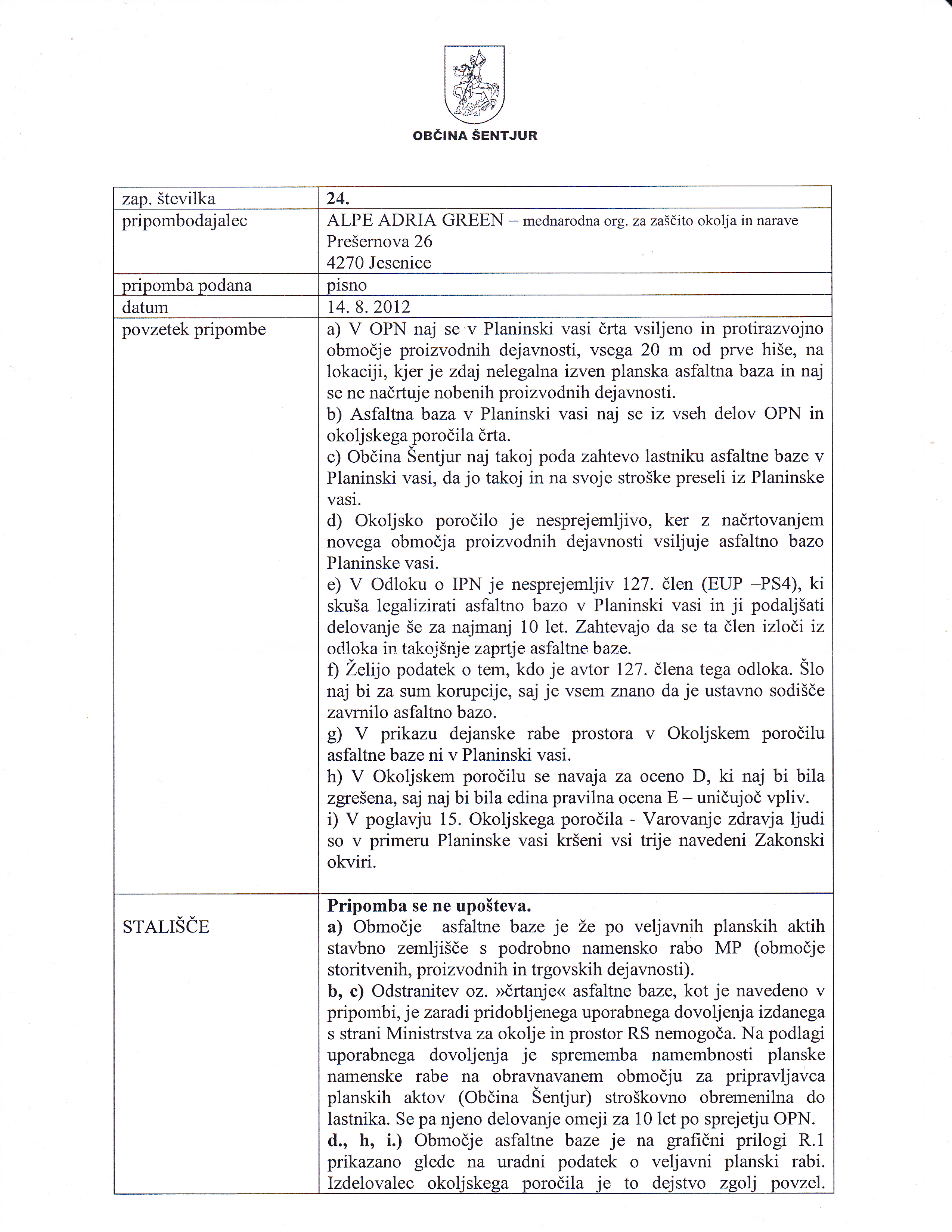 Odzivamo se na objavo nevladne okoljske organizacije Alpe Adria Green (dalje:AAG),da je njena komisija izbrala Agencijo Republike Slovenije za okolje (dalje:ARSO) za ime drugega četrtletja na črni listi AAG in sicer zaradi izdaje okoljevarstvenega dovoljenja št. 35430-20/2011-6 za obratovanje bioplinarne upravljavca Bioštrom d.o.o., Zgornje Pirniče 71E, 1215 Medvode. Obveščamo tudi, da je dne 26. 6. 2012 prejeti dopis AAG,v katerem je izražena zahteva za vključitev v postopek izdaje okoljevarstvenega dovoljenja, na ARSO v obravnavi.