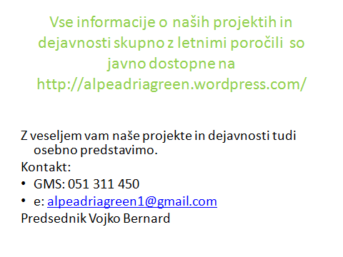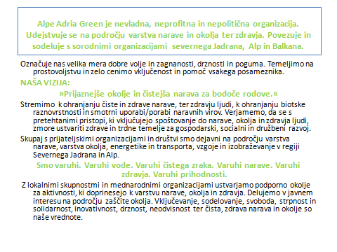 MEDNARODNA NEVLADNA OKOLJEVARSTVENA ORGANIZACIJA ZA ZAŠČITO OKOLJA IN NARAVE – SPLETNA STRAN- NEPROFITNI DEL: https://alpeadriagreen.wordpress.com/