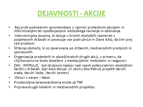 AAG, kot član svetovnega združenja okoljevarstvenih NVO TCK,TCK,TCK ter Evropskega Združenja NVO GENERATION AWAKE, v Sloveniji deluje kot mednarodna okoljevarstvena organizacija v javnem interesu na področju okolja in na področju narave. Odločbi, za to delovanje v javnem interesu AAG, je izdalo Ministrstvo za kmetijstvo in okolje RS.